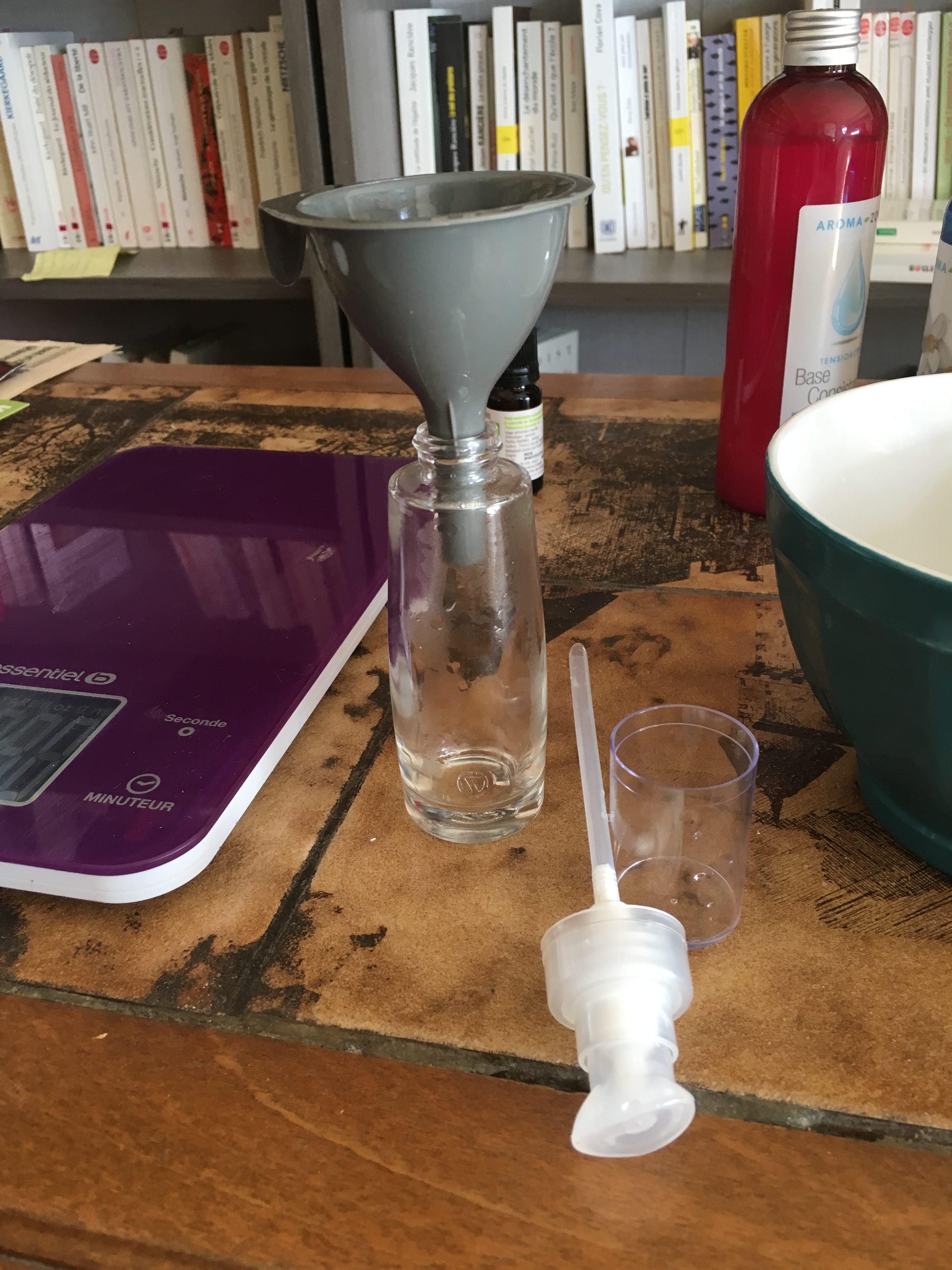 Mélange tous les ingrédients à l’aide d’une spatule (en prenant soin d’éviter que le mélange ne mousse) et verse le tout dans le flacon.