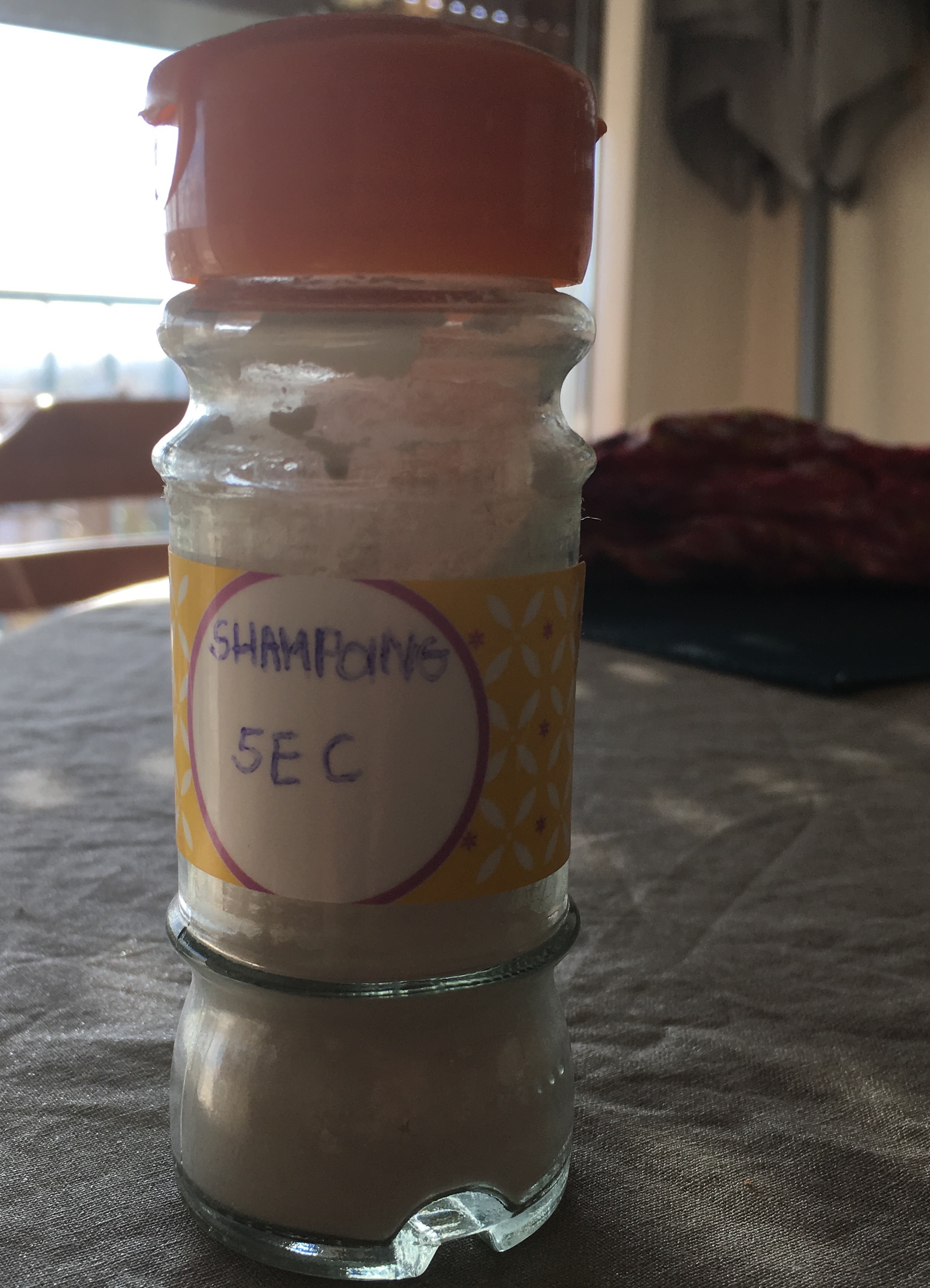 Très utile pour les personnes dont les cheveux graissent rapidement, les shampoing secs sont beaucoup utilisés. La plupart vendus dans le commerce le sont sous forme de brumisateur. Or, les brumisateurs utilisent, pour la plupart, des gaz comme propulseurs, (dioxyde de carbone, protoxyde d’azote, diméthyl éther), qui sont inflammables et le 134, (Tétrafluoro éthane) qui n’a pas d’effet sur la couche d’ozone mais qui augmente l’effet de serre. De plus, une fois vides, les contenants, ne sont pas réutilisables, et pas toujours recyclables. Les résidus de gaz peuvent être dangereux car ils risquent d’exploser devant une source de chaleur. [source] Bref, génial non ? On va procéder autrement du coup !