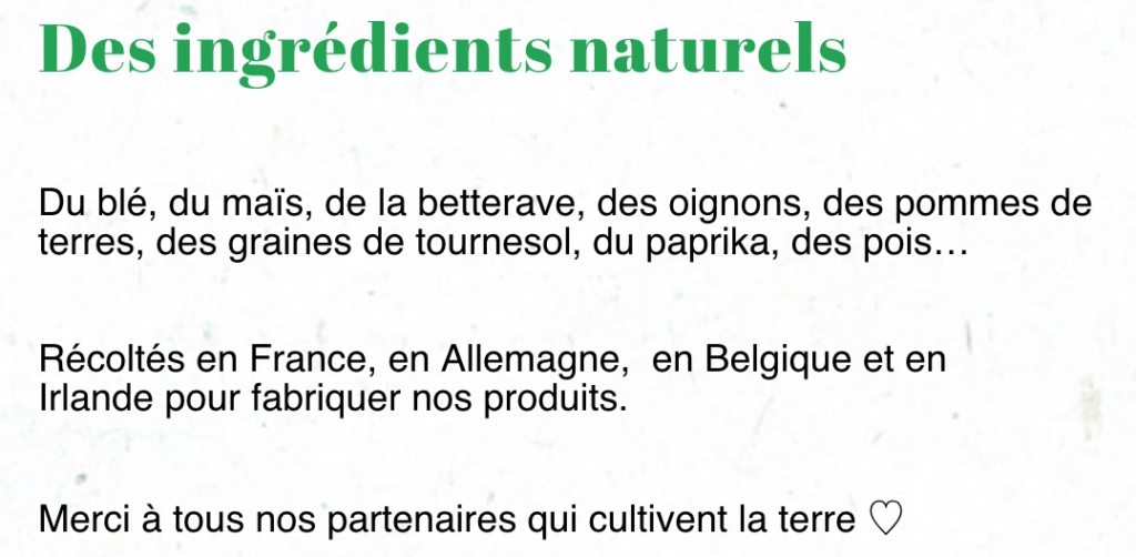 La marque promet des produits 100% végétaux, exigeant dans la production 11 fois moins de CO2 et 4 fois moins d’eau que les produits animaux dans le commerce. Ils sont également sans colorants artificiels, très peu gras et sans huile de coco.