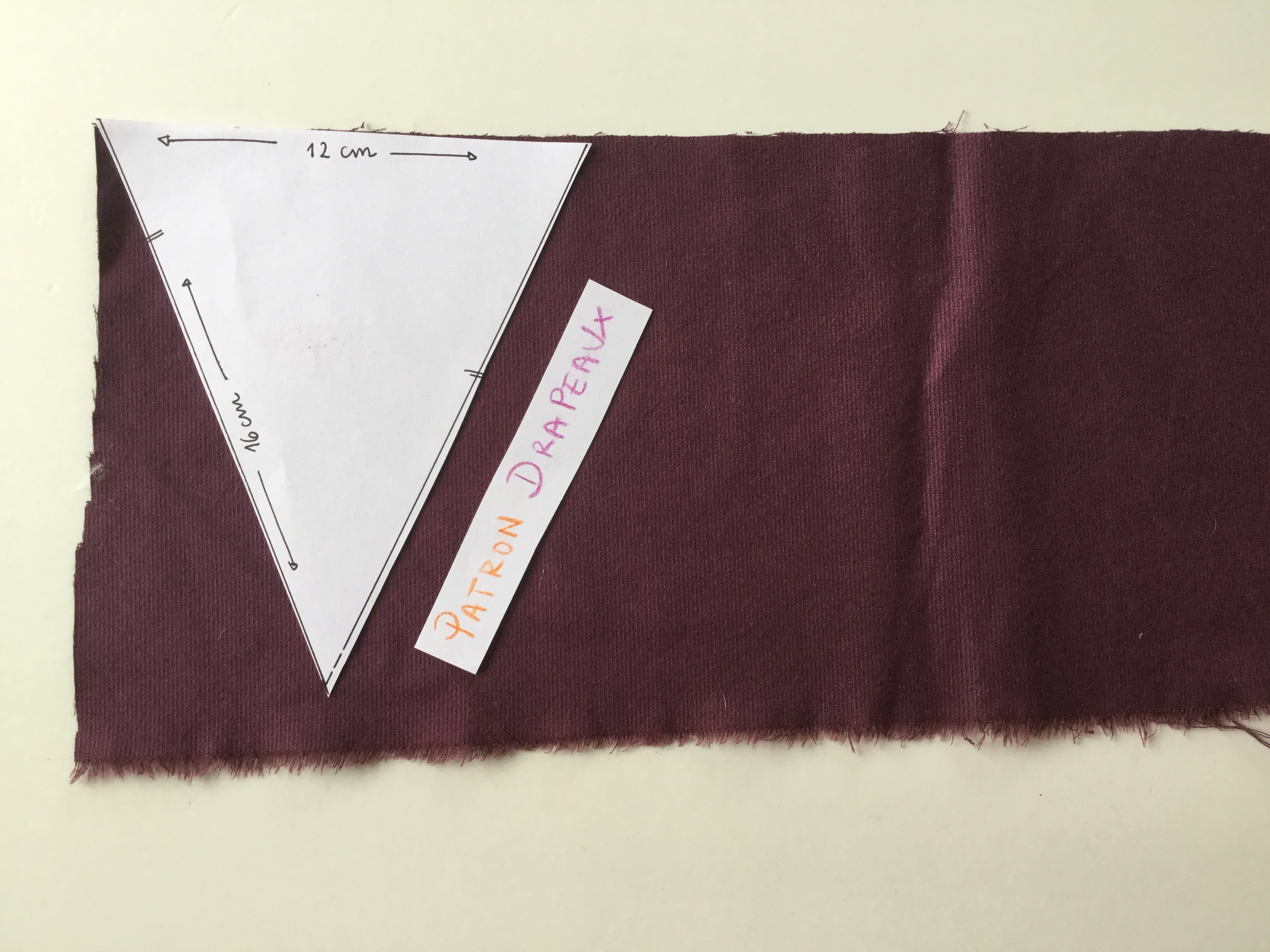 Astuce : toujours prévoir un à plusieurs centimètres de plus lorsque l’on coupe pour prévoir large et éviter que ce ne soit trop court à l’assemblage, dans le cas présent ce n’est pas nécessaire (on ne va pas replier les drapeaux)