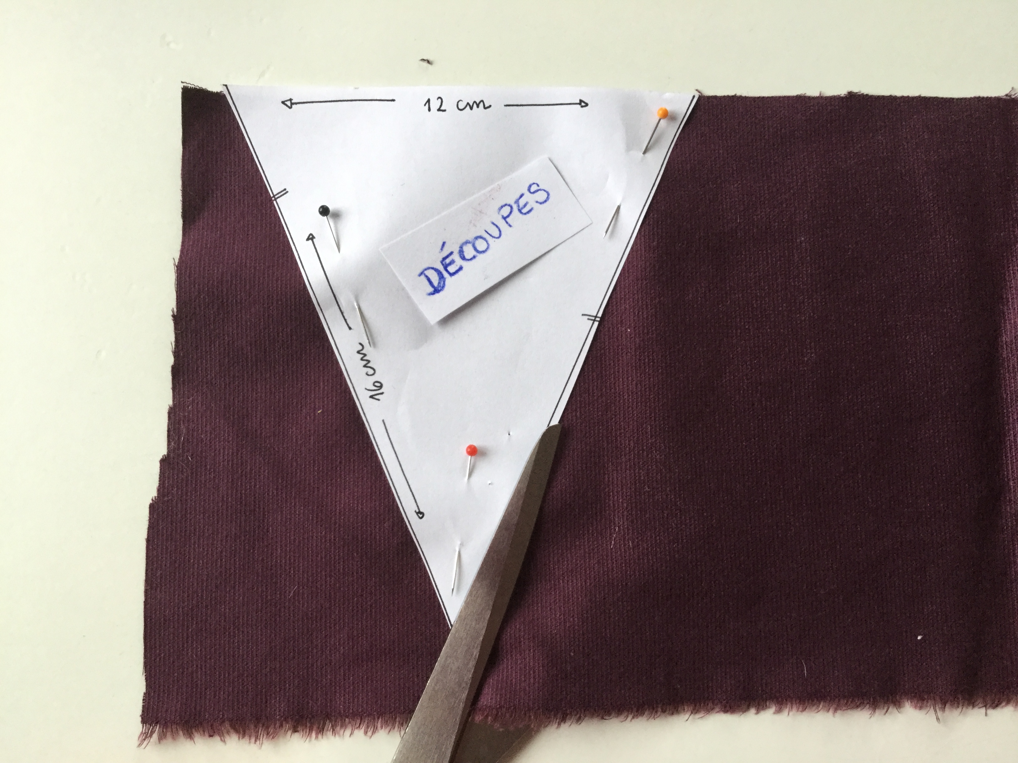 Placez le patron sur votre tissu de manière à faire le moins de perte possible. Fixez-le avec les épingles et coupez ! Il faut en tout réaliser 20 triangles de tissus variés. Pour aller plus vite, vous pouvez préparez plusieurs patrons et coupez plusieurs triangles à la suite. Si vous vous sentez assez à l’aise, vous pouvez même superposer plusieurs couches de tissus et coupez plusieurs triangles en même temps.