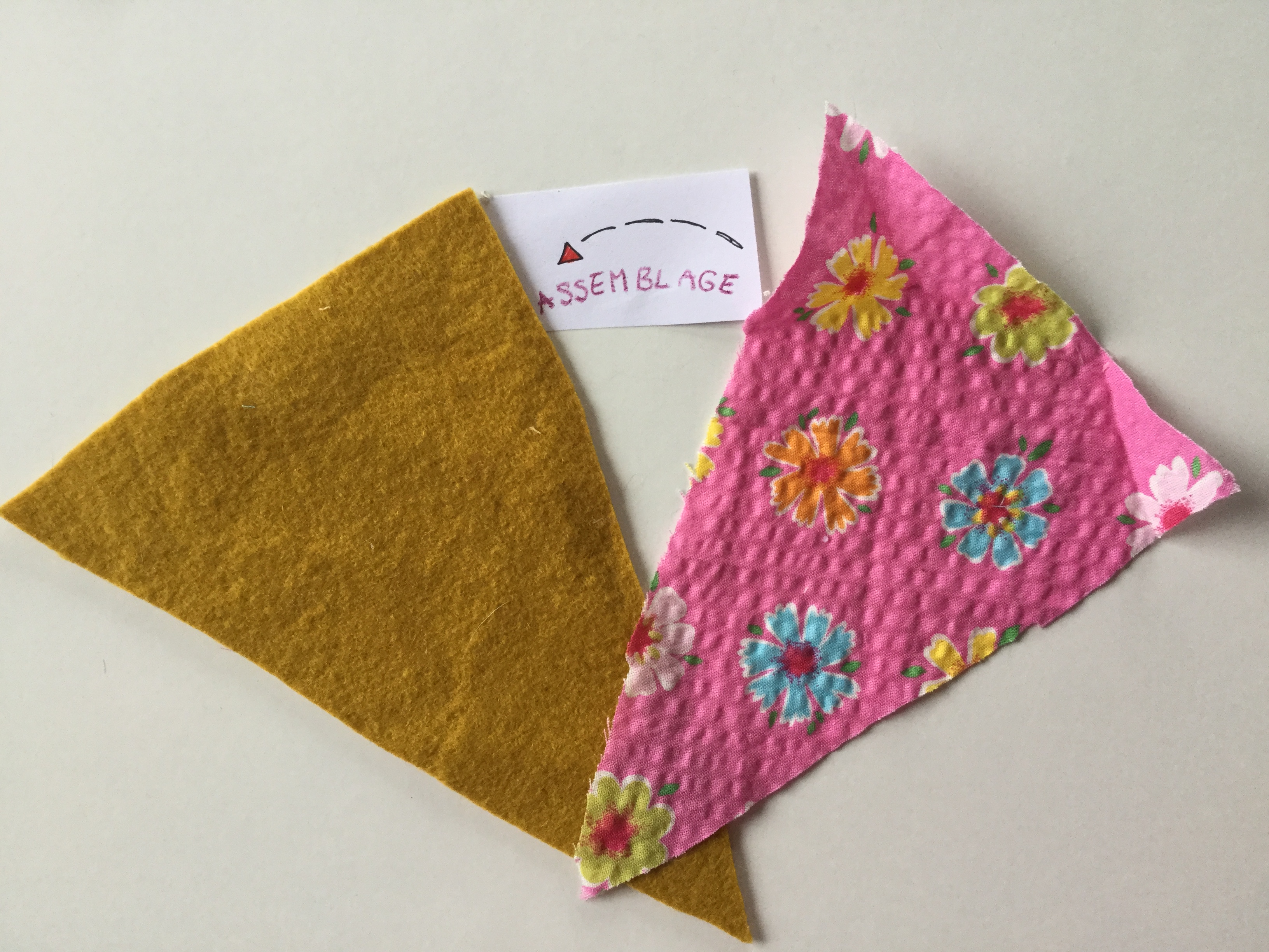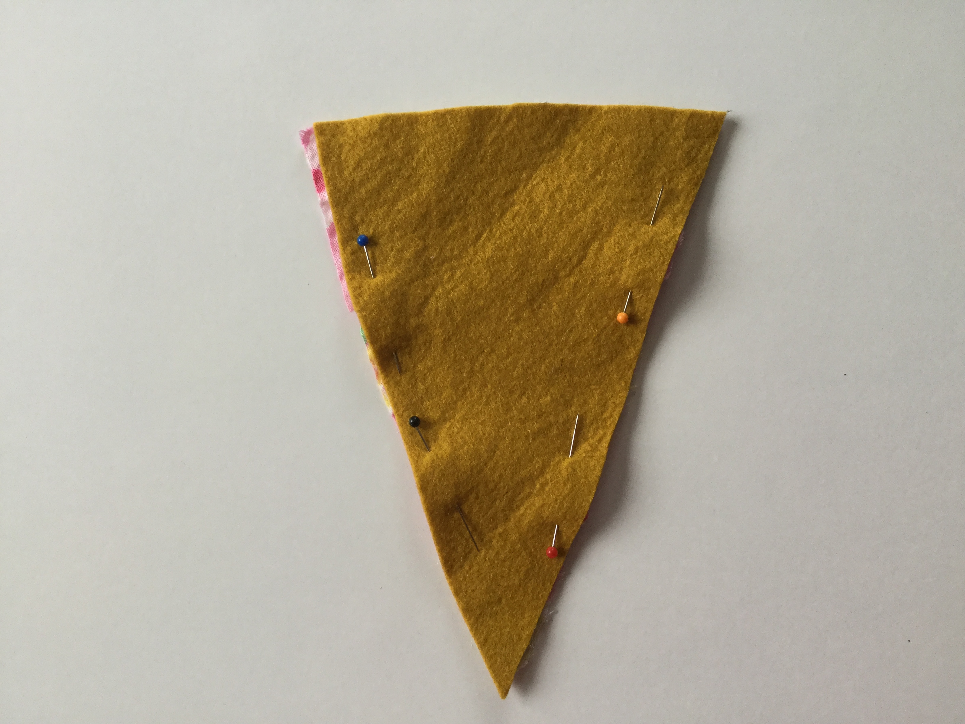 Épinglez deux triangles de tissus ensemble, de couleurs différentes ou non (c’est plus sympa avec pleins de couleurs !). Pas besoin d’épingler le haut du triangle.