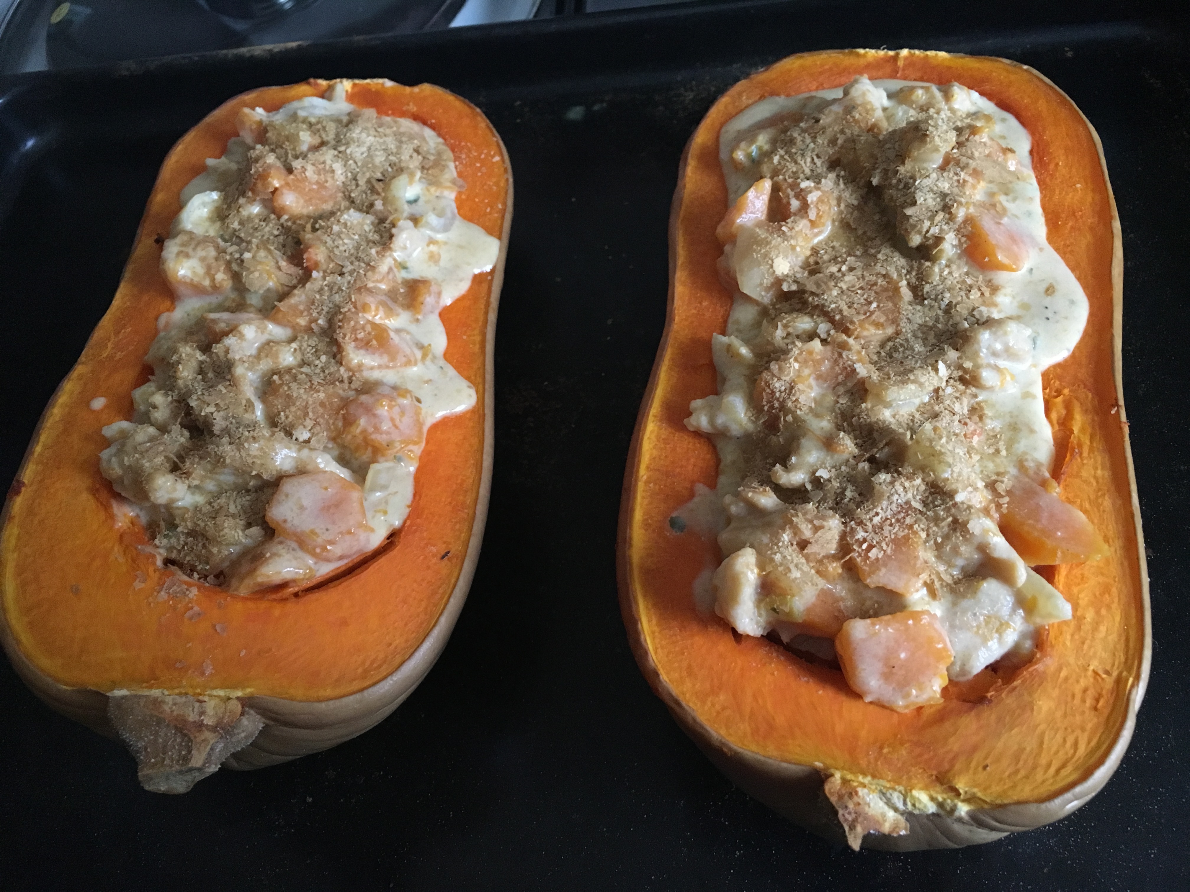 Pour le déjeuner, je vous propose une butternut farcie ! Alors certes, c’est vraiment la fin de la saison des courges mais il en reste encore quelques-unes sur le marché… Pour cette recette j’ai choisi d’adapter celle de Marie Laforêt de son livre « vegan » (la Bible à avoir chez soi pour tous les végétalien.ne.s !).