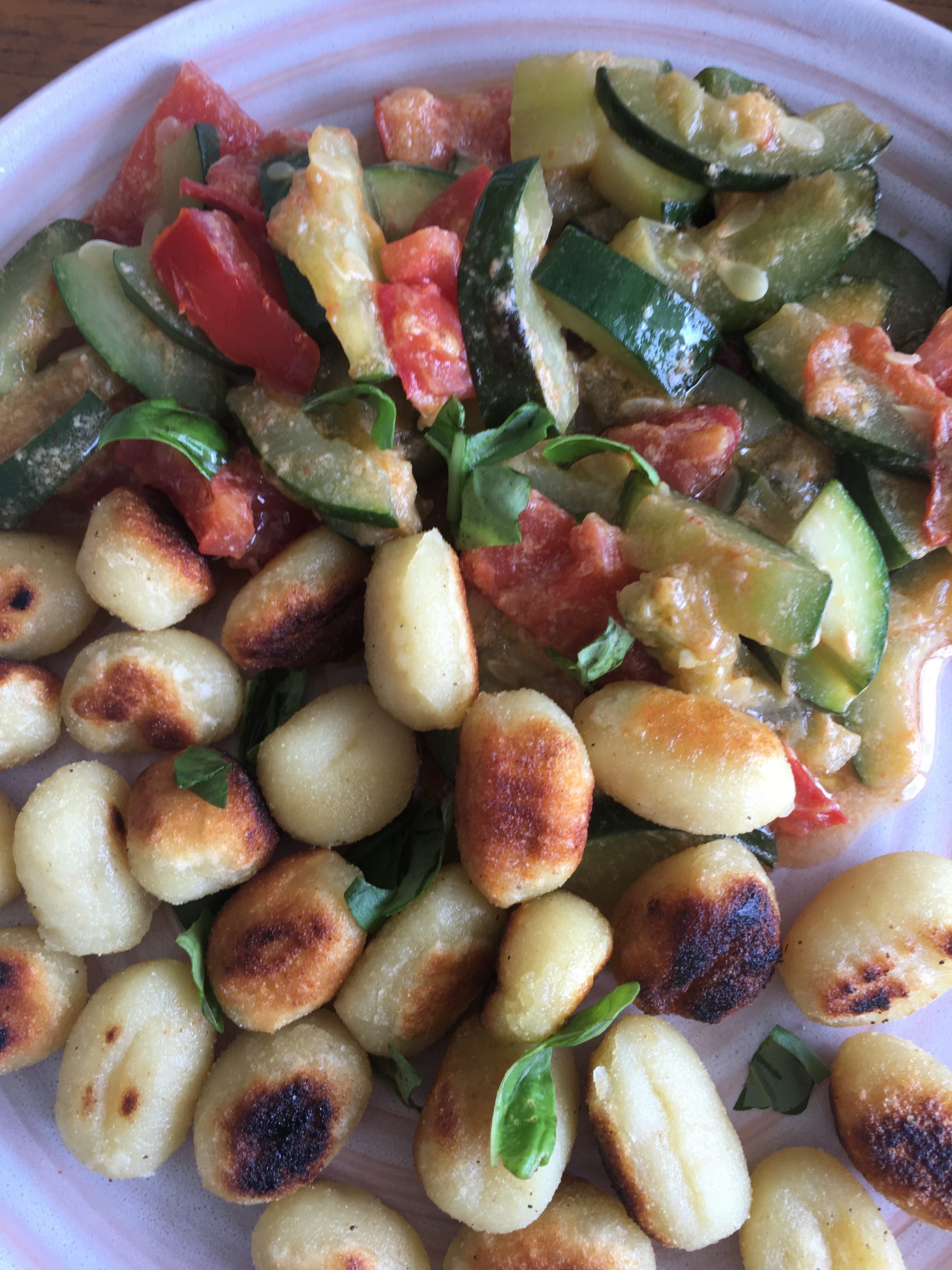 À gauche : des gnocchis avec des tomates/courgettes et du basilic frais !