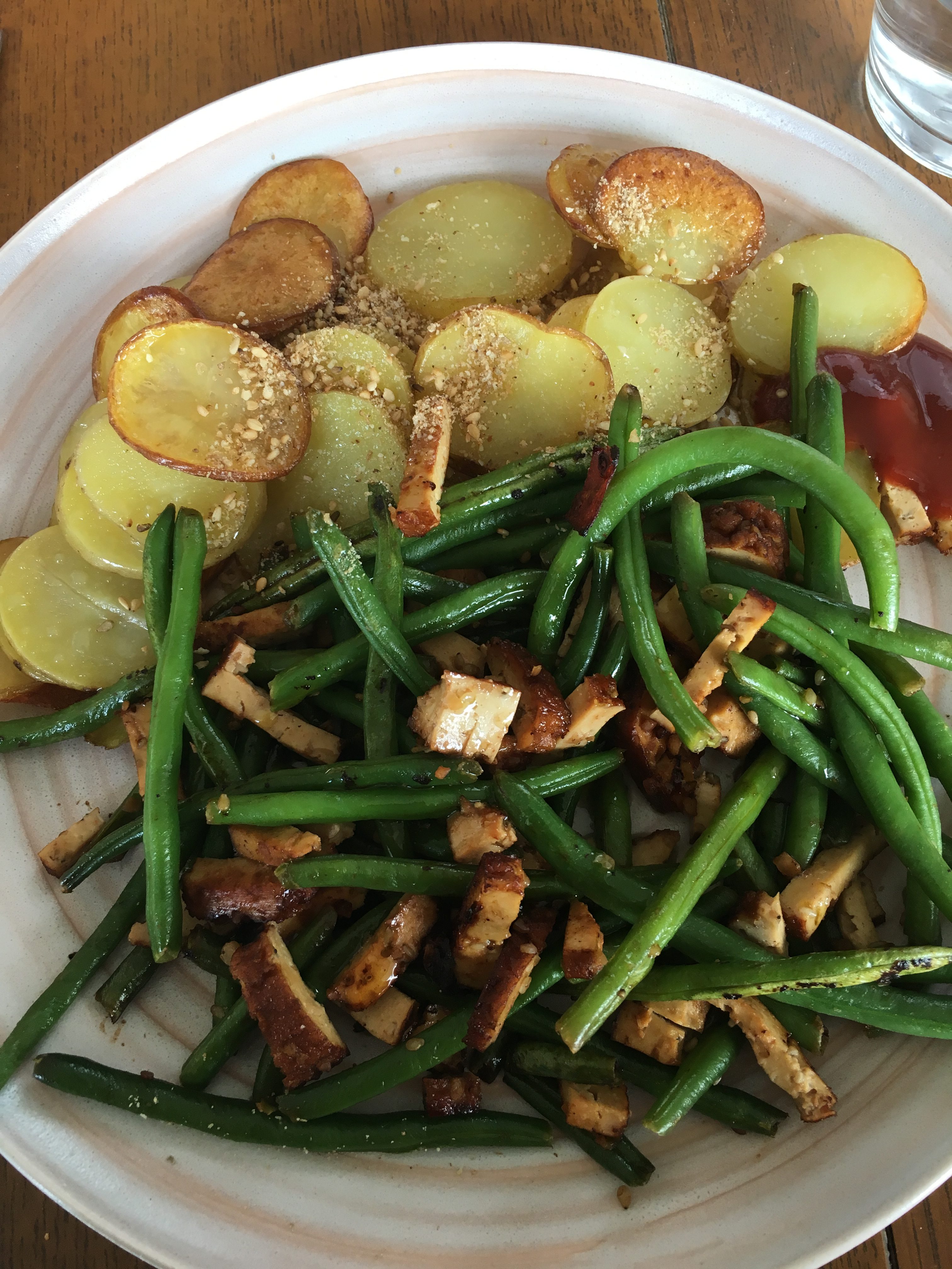 À droite : des haricots verts surgelés revenus avec un peu de sauce pimentée avec des pommes de terre finement coupées et revenues dans de l’huile de tournesol. Et des lamelles de tofu fumé !