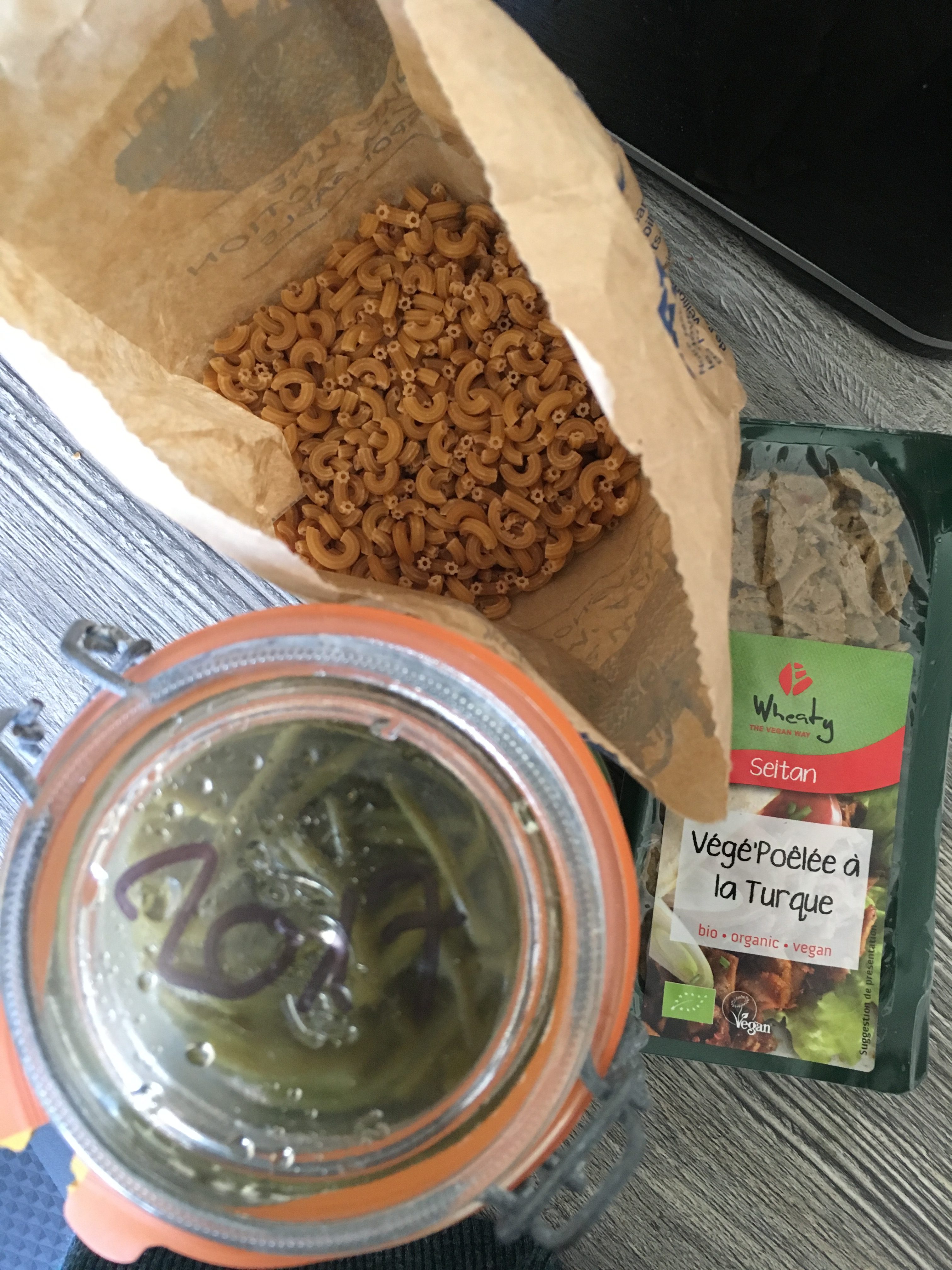 Cuire les haricots verts avec la VégéPoêlée à la Turque (seitan) avec de la crème de soja. Faire cuire les pâtes (on les trouve en vrac en Biocoop) environ 15 minutes. Régalez-vous, parce que quand même, c’est super bon.