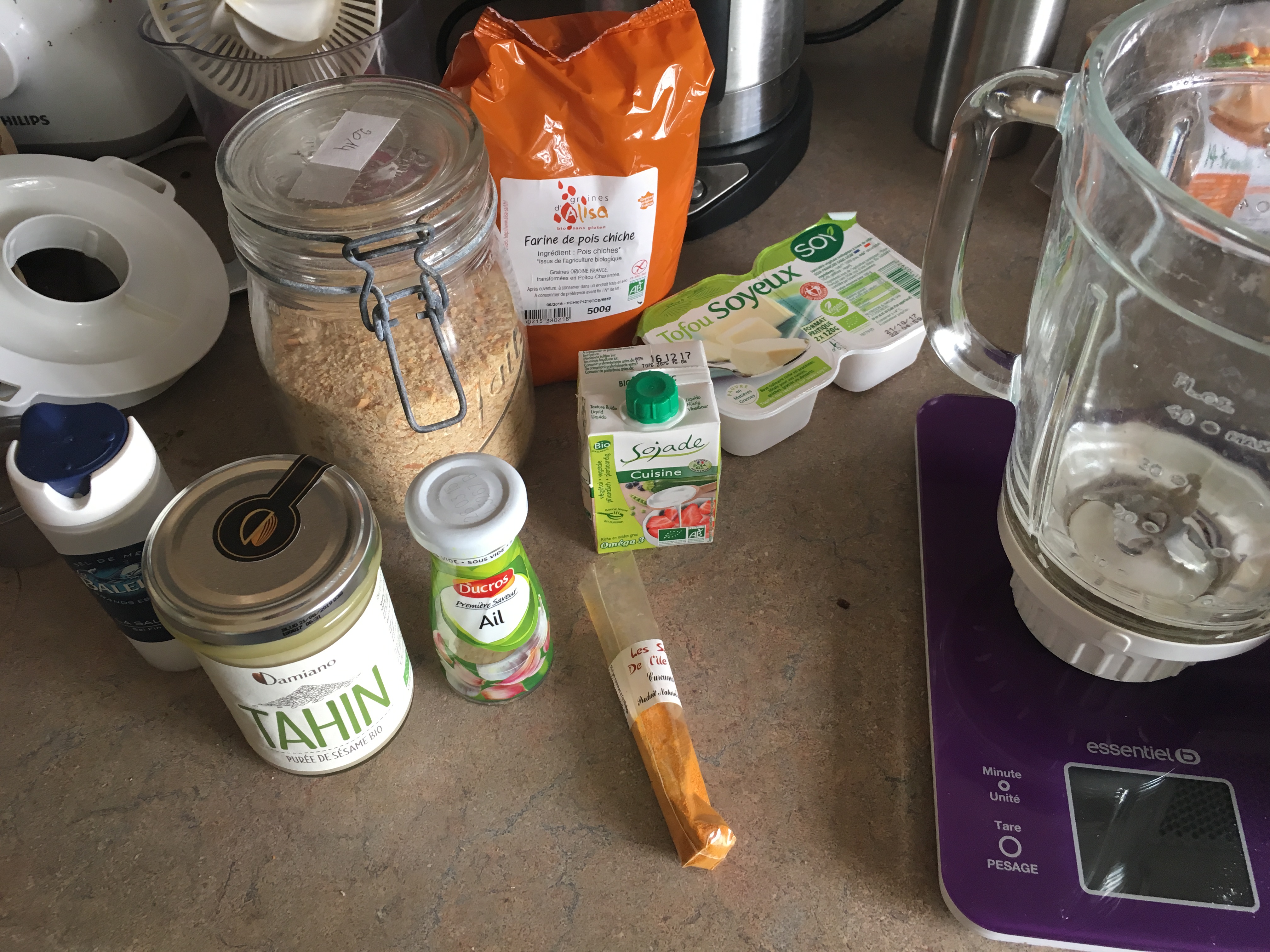 120g de tofu soyeux ; 70ml de crème de soja ; 20g de farine de pois chiche ; 1 c.à.s de Tahin ; 1c.à.c de levure maltée ; ½ gousse d’ail ; une pincée de curcuma moulu ; du poivre et du sel