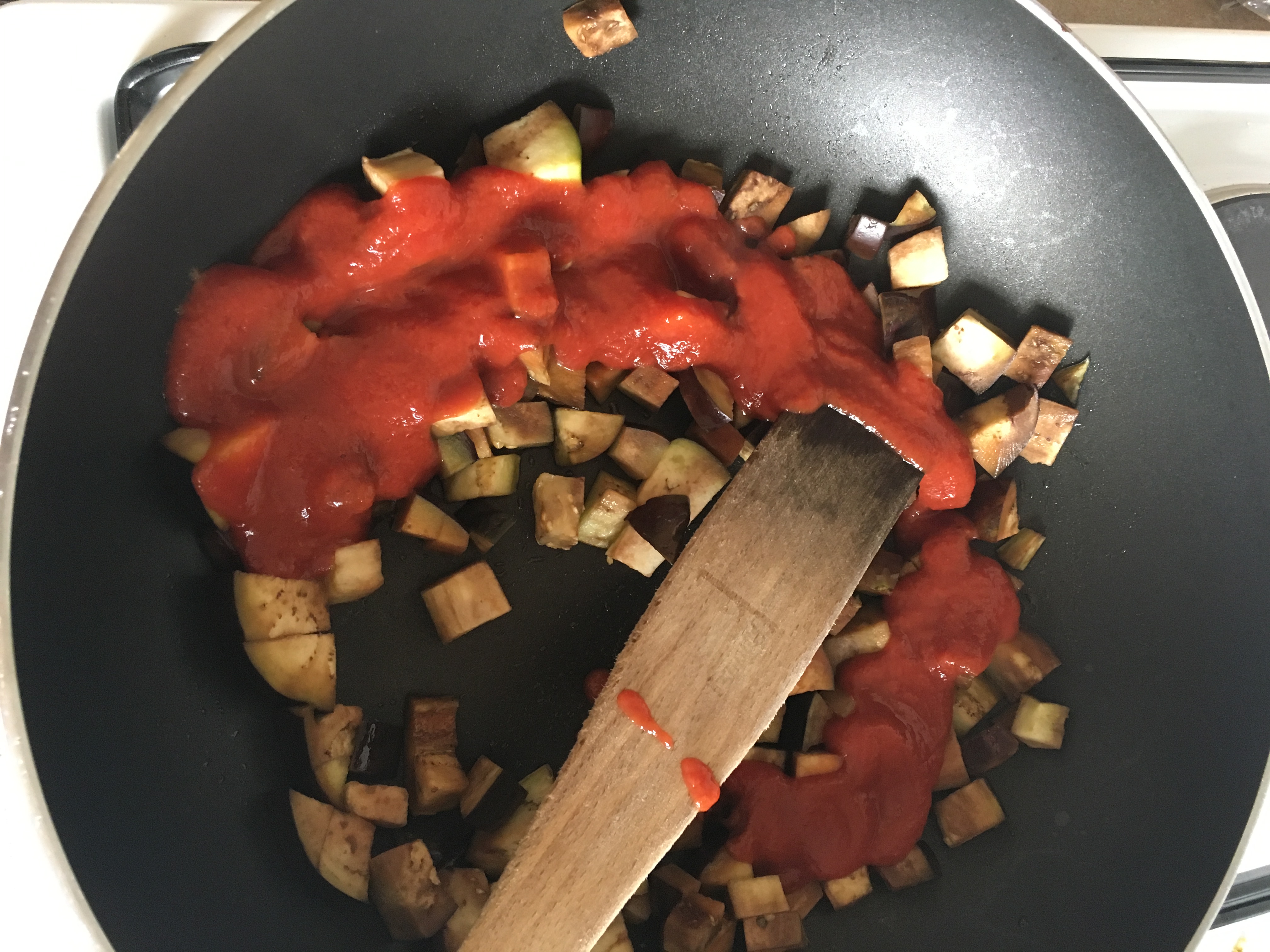 1/ Découpez votre aubergine en petits cubes, faites-la revenir dans une poêle à feu doux avec un peu d’huile végétale (ou de margarine). Remuez régulièrement pendant 5 minutes. Ajoutez le coulis de tomate et ½ cuillère à café de sirop d’agave. Faites mijoter le tout 15 minutes.